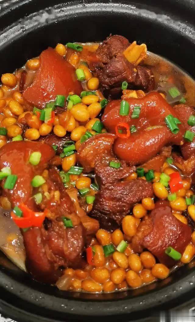猪蹄1只、黄豆100克、香菇5朵、干鱿鱼1条、冰糖适量、干辣椒3个、姜蒜适量、卤汁适量