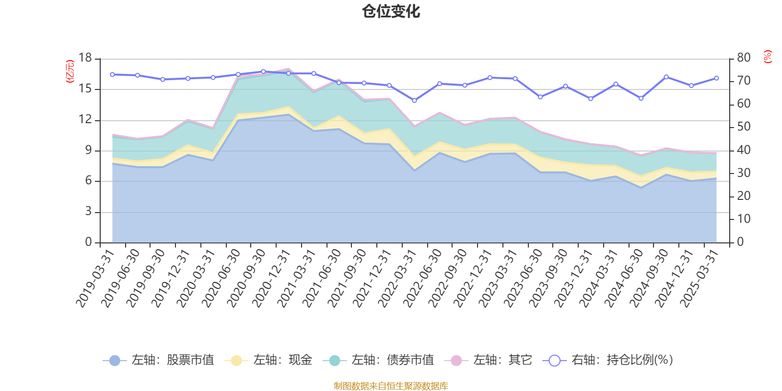 据定期报告数据统计,近三年平均股票仓位为68.19%,同类平均为85.79%。2020年三季度末基金达到74.4%的最高仓位,2022年一季度末最低,为61.83%。