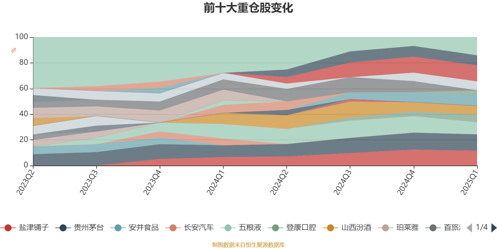 该基金持股集中度较高,近2年前十大重仓股集中度长期超过60%。截至2025年一季度末,基金十大重仓股分别是贵州茅台、美的集团、盐津铺子、五粮液、开润股份、石头科技、泸州老窖、山西汾酒、登康口腔、比亚迪。
