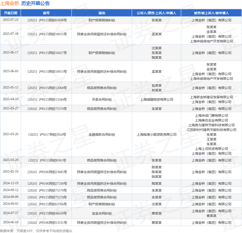 案号:(2025)沪0115民初16027号审理法院:上海市浦东新区人民法院案由:财产损害赔偿纠纷当事人信息: 原告/上诉人:沈某某、张某某、陶某某 被告/被上诉人:上海金桥(集团)有限公司开庭日期:2025年6月17日根据统计,近一年内以上海金桥(集团)有限公司为当事人的历史开庭公告有16则,其中案由为“商品房预售合同纠纷”的公告以5则居首,其次为“民事主体间房屋拆迁补偿合同纠纷”有5则,“财产损害赔偿纠纷”有3则。历史开庭公告如下: